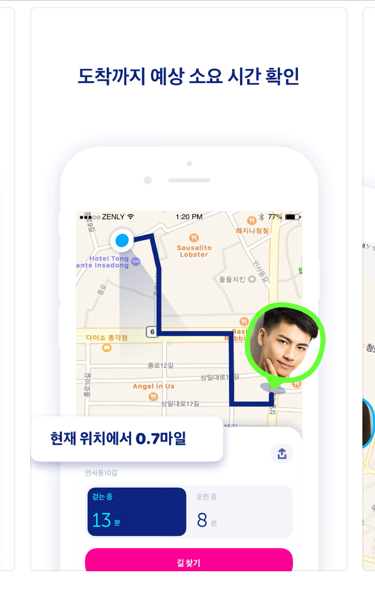 친구들의 자세한 위치정보를 지도에서 확인할 수 있고, 도착 예상 소요시간까지 확인 가능해서 서로 현재 어디에 있는지 얼마나 걸리는지 물어볼 필요가 없어요. 이 위치 추적은 국내를 너머 전 세계에 있는 친구의 위치를 공유하고 있어요.