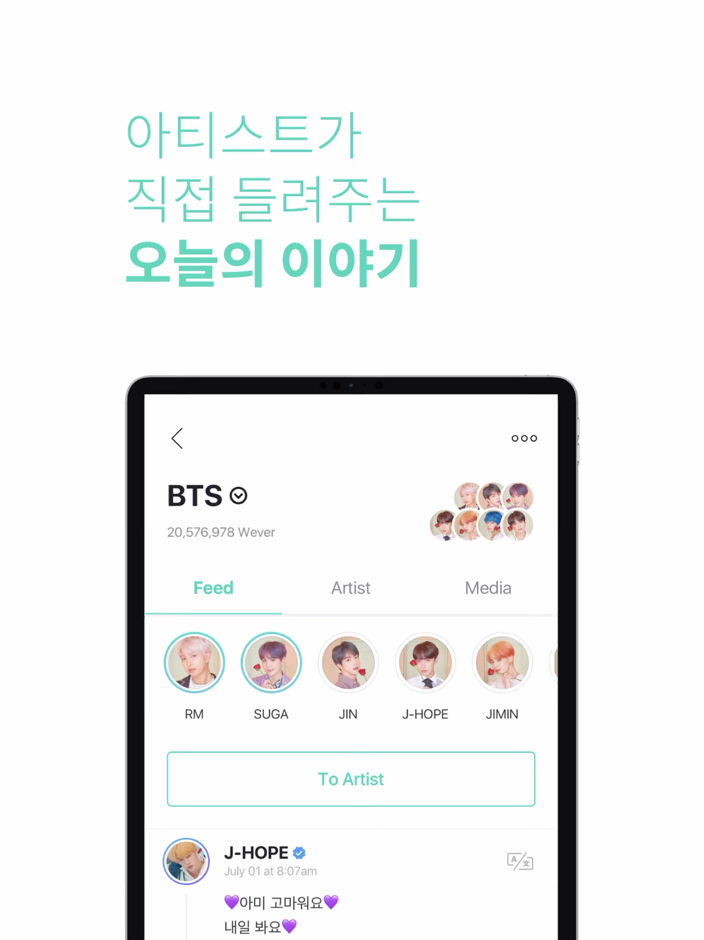 글로벌 공식 팬클럽 어플리케이션 위버스 Weverse 어플에서 좋아하는 아티스트 영상을 감상할 수 있어요. 또한 아이돌 아티스트에서 글을 쓰고 응원할 수 있으며 아티스트가 직접 들려주는 이야기를 볼 수 있어서 인기에요. 특히 방탄소년단 BTS가 글로벌 스타로 전세계적인 인기를 누리고 있어 해외팬들도 발걸음이 잦다고 해요.