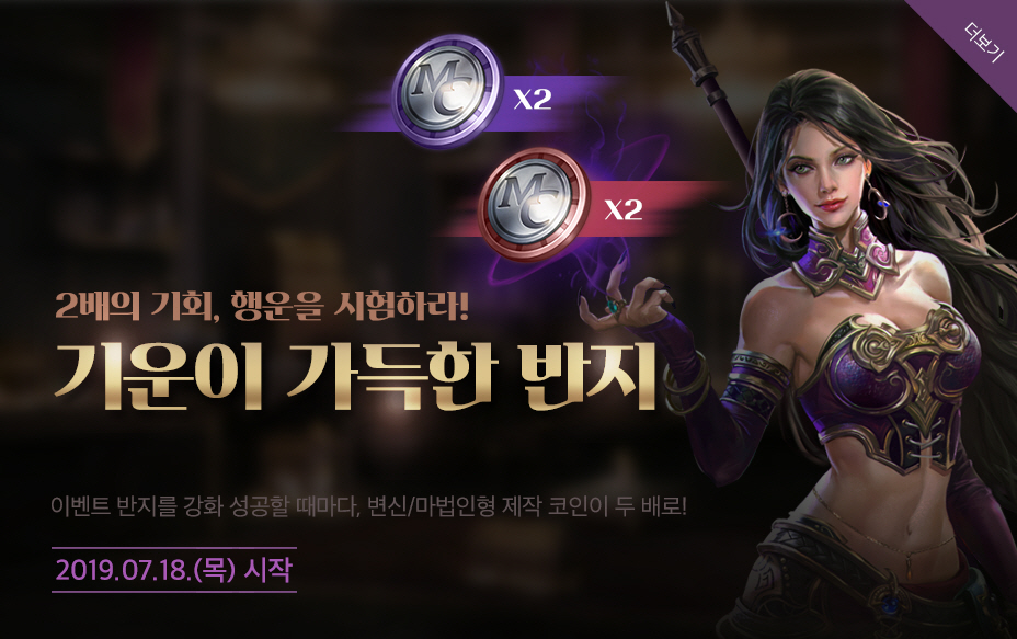 리니지M 업데이트 2주년과 함께 이벤트로 2배의 기회 행운을 받을 수 있으며 아이템 반지를 강화 성공할 때마다 코인을 두배로 받을 수 있는 이벤트가 진행중이에요.